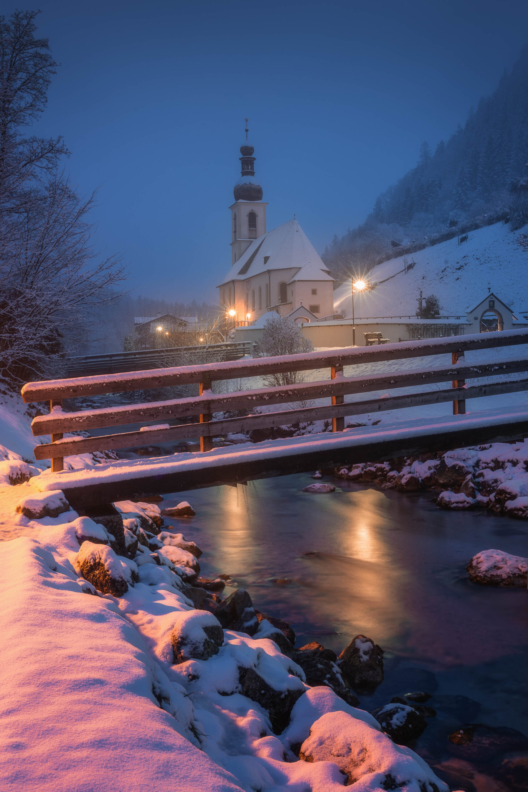 Ich hatte den Wecker so eingestellt, dass mir genügend Zeit in der Blauen Stunde bleiben sollte, die Kirche, die zentral in Ramsau gelegen ist, fotografieren zu können. Parken kann man eigentlich fast direkt am Spot am Straßenrand. Ich musste nur ein paar Meter hin zur Brücke durch den Schnee laufen. Die Straßen waren bis dato nicht gestreut und teilweise voll unter Neuschnee. Für mich als geübter Fahrer im Winter bei Schnee kein Problem. Andere hätten sich vielleicht nicht so recht getraut, aber machbar war es allemal, vor allen Dingen, wenn man sich einige Minuten Zeit einräumt.