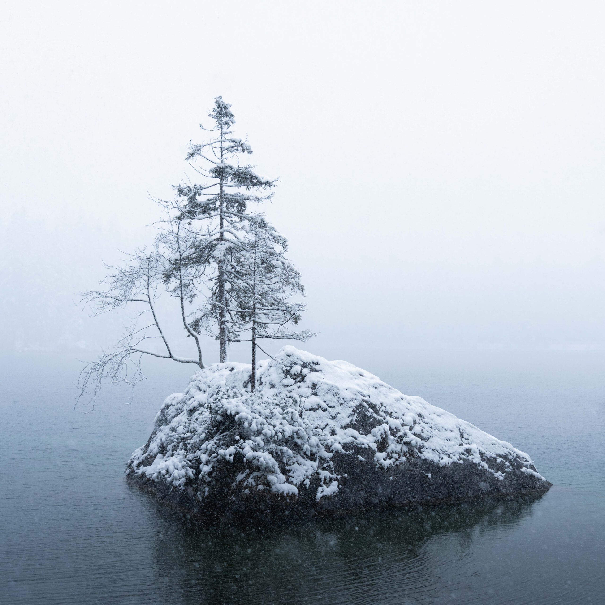 Teilweise verstärkte sich der Schneefall sogar auf eine Menge, dass man das gegenüberliegende Ufer nicht mehr sehen konnte. Dies führte allerdings zu tollen schönen minimalistischen Bildern, so wie dieses von einer der bekannten Felsinseln des Hintersees.