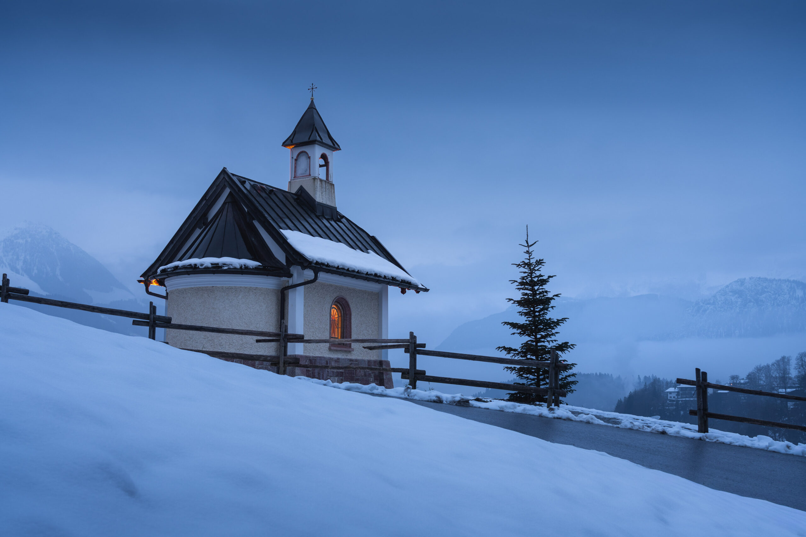 Der nächste Morgen führte mich dann hoch auf einen Hügel über Berchtesgaden selbst, um dort ein ganz berühmtes Motiv zu fotografieren: Die Kirchleitn Kapelle. Im Duett mit dem im Hintergrund normal zu sehenden Watzmann ergeben sich wunderschöne Bilder. Das Problem: Der Watzmann wollte sich nicht zeigen.