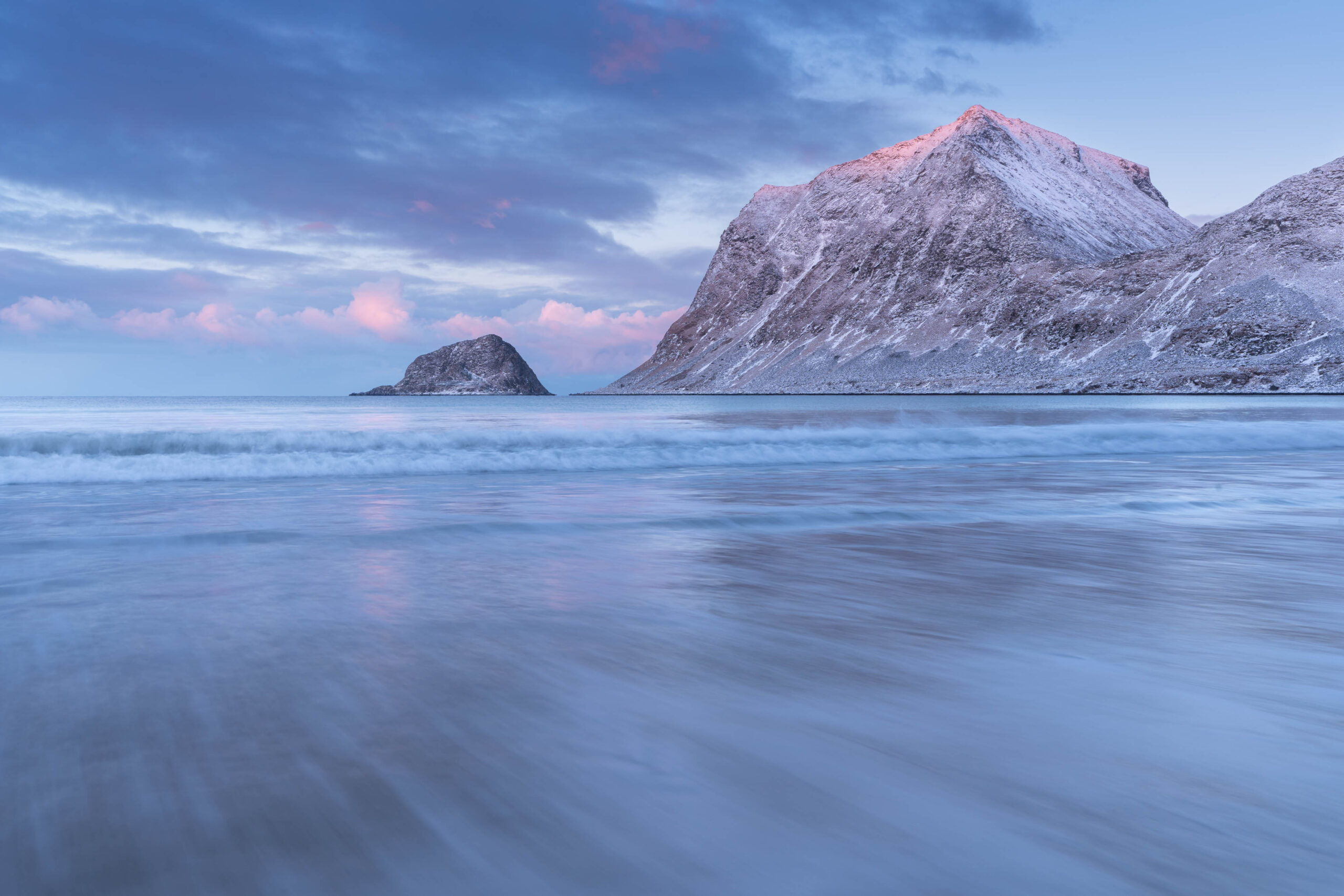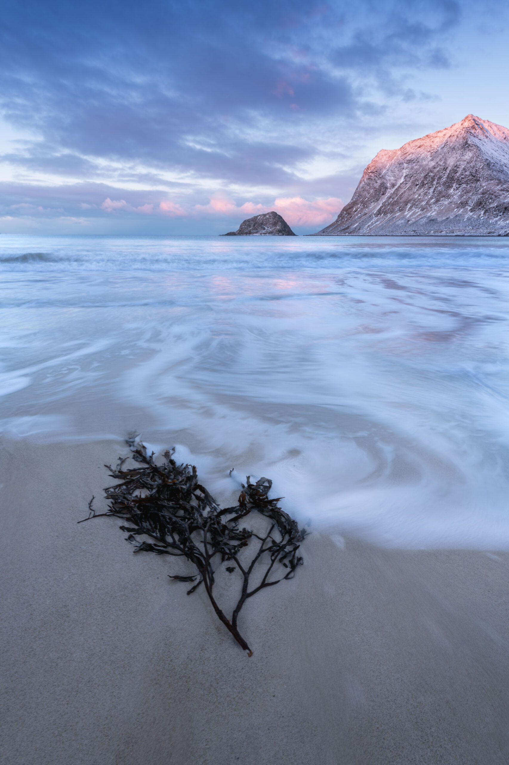 Dann war ich da. Jens stand schon parat und nahm uns mit zur Unterkunft. Die erste Nacht schlief ich durch und jetzt stehe ich bei minus 5°C am berühmtesten Strand der Lofoten — Haukland. Aber da ist ja nur Sand und ein Berg im Hintergrund. Was soll man da nur fotografieren!?