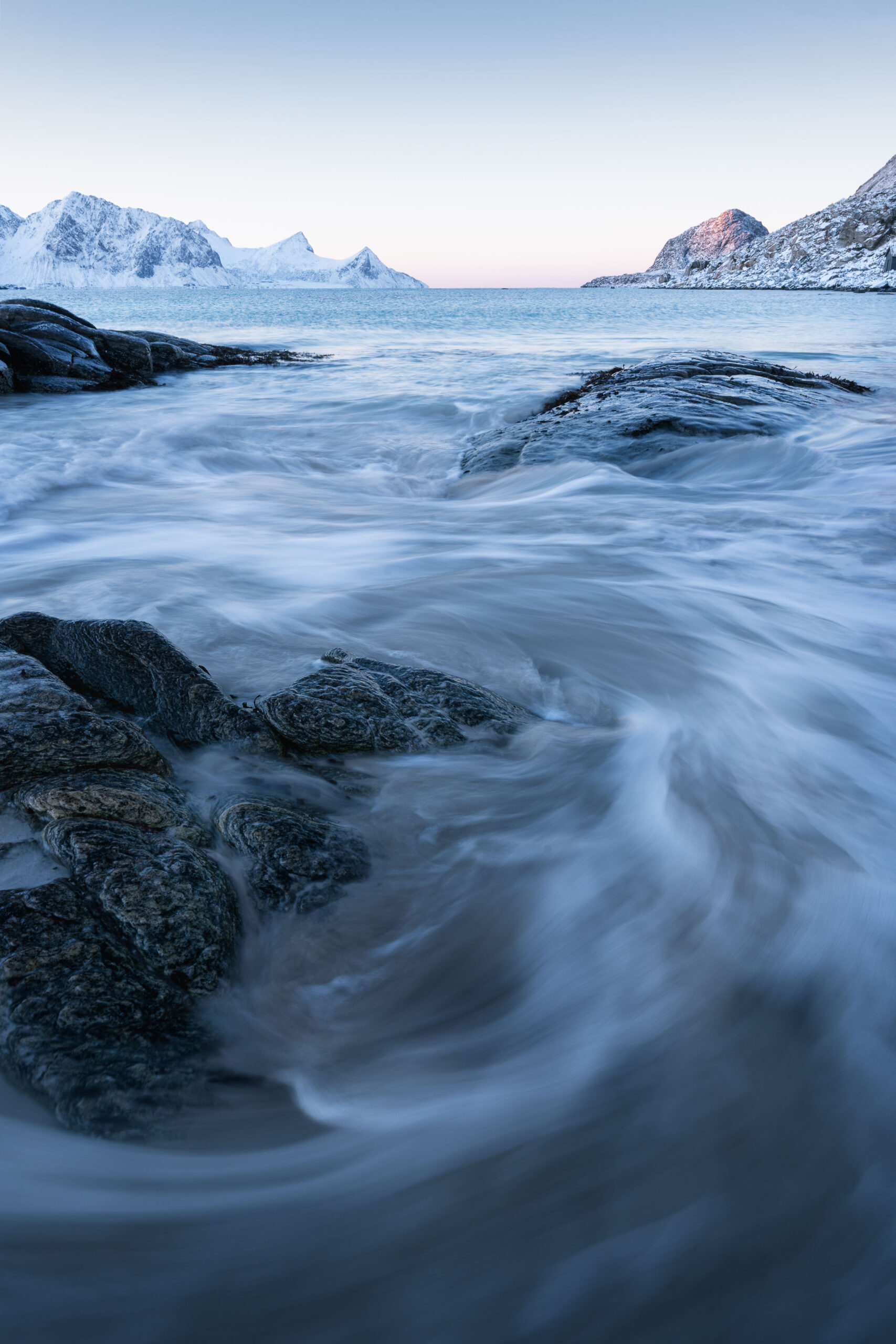 Ansonsten achte ich natür­lich auf inter­es­sante Vorder­gründe, wie schnee­be­deckten Felsen oder auch Felsen, die über­zogen mit einer Eisschicht sind. Die Belich­tungs­zeit ist dann abge­stimmt auf die Wellen­ge­schwin­dig­keit. Ich mag es, wenn man Wasser als Wasser erkennt und sogar der ein oder andere Einschlag einer Welle zu sehen ist.