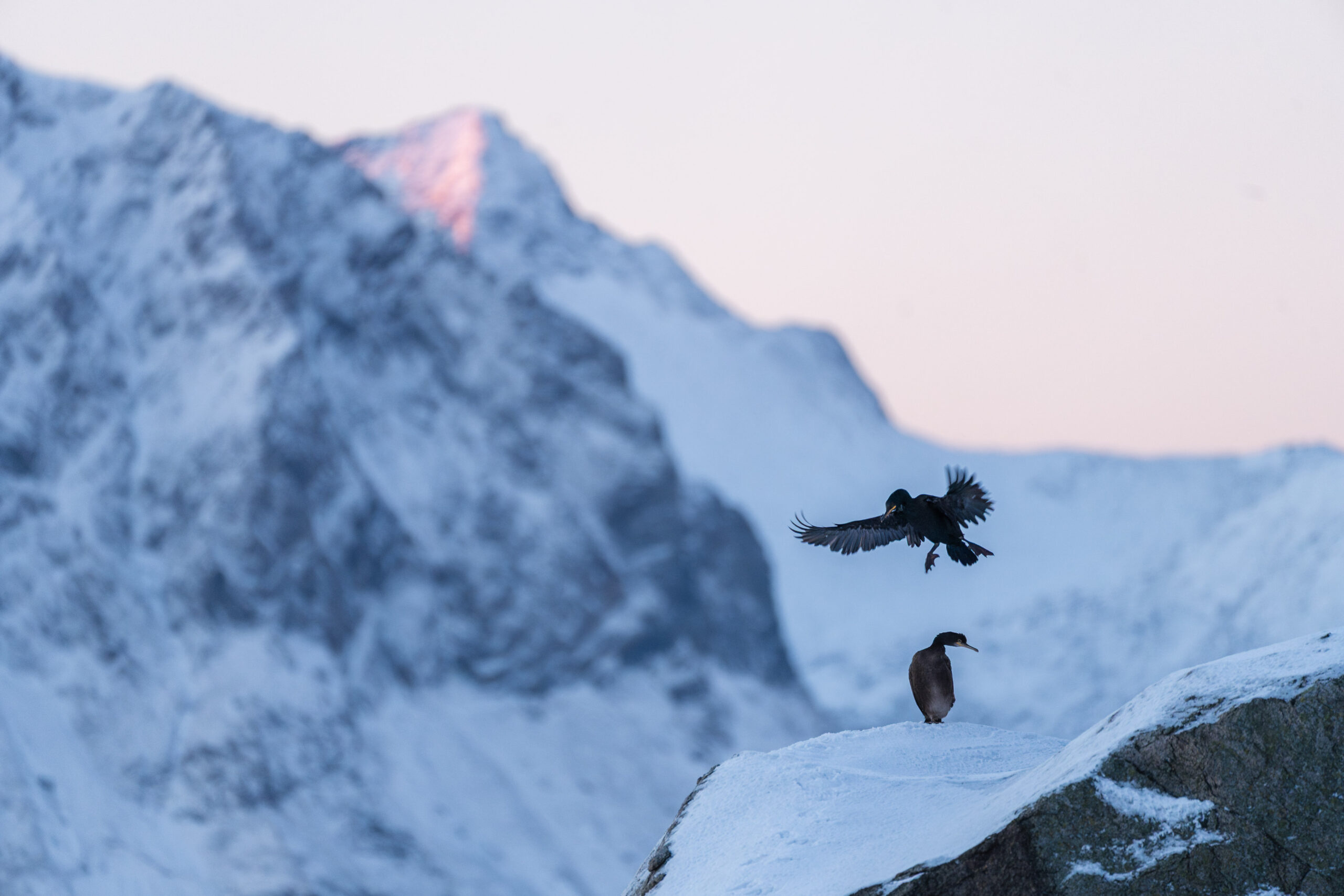 Ich entdeckte einen Kormoran auf einem Felsen sitzen. Das Licht auf dem Berg hinten sorgte für etwas Kontext. Ich hoffte darauf, dass der Kormoran gerade gejagt hatte und ggf. seine Flügel trocknet oder ähnliche Verhal­tens­weisen, dass das Bild etwas beson­deres bekommt. Doch er saß minu­ten­lang nur da und schaute mal links, mal rechts. Dann aber kam ein weiterer Kormoran ange­flogen. Ich reagierte blitz­schnell und schoss im Seri­en­bild­modus. Daraus sind 2–3 tolle Bilder entstanden. Hier ist eins aus der Serie.